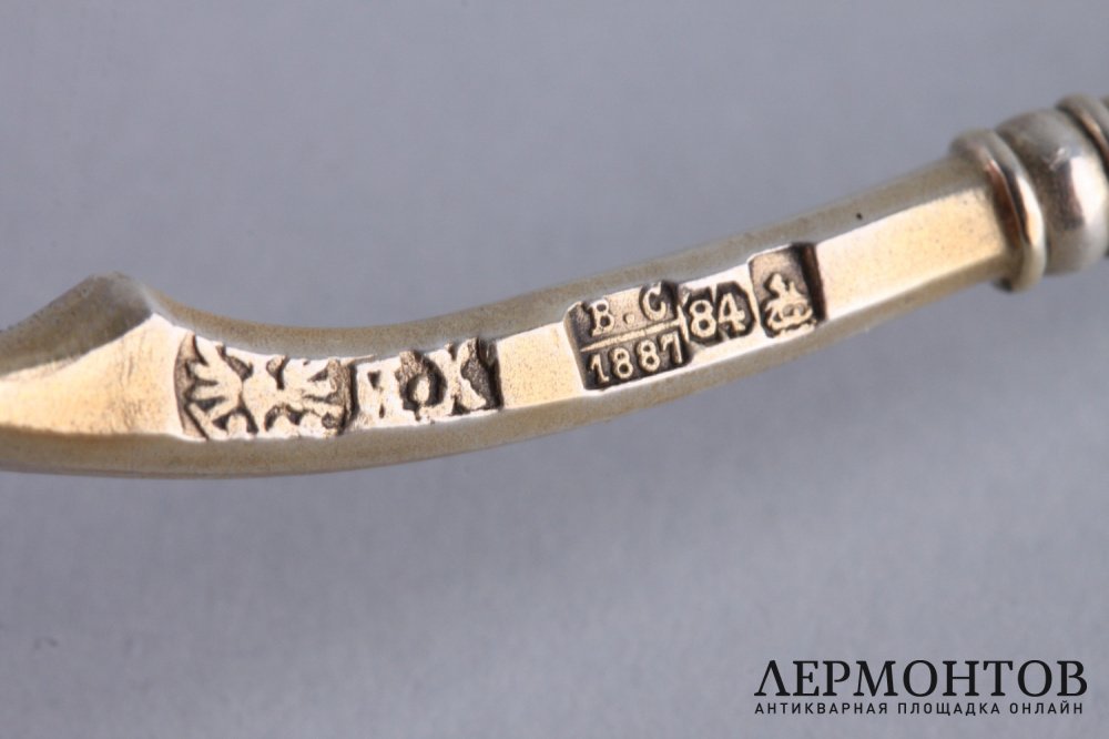 Обращаем ваше внимание на то, что изделие выполнено из серебра 84 пробы, о чем свидетельствуют клейма и экспертная оценка. Клейма: пробирного мастера "В.С" с годовым клеймом "1887"; цифровое обозначение пробы "84"; городское клеймо Москвы - "Всадник"; именник мастеркой "И.Х" с двуглавым орлом.