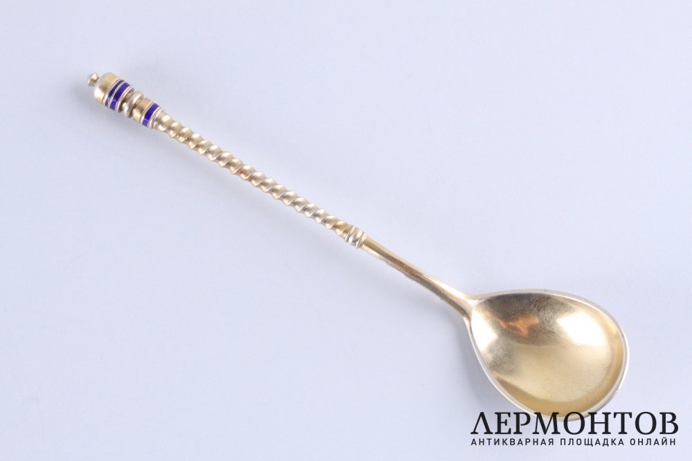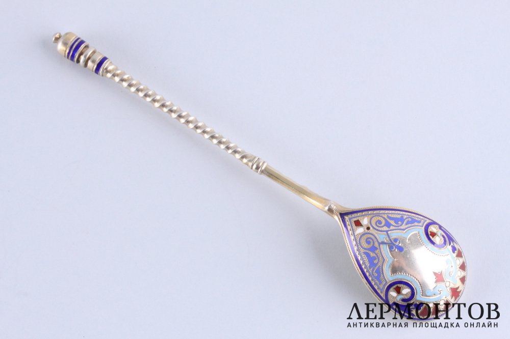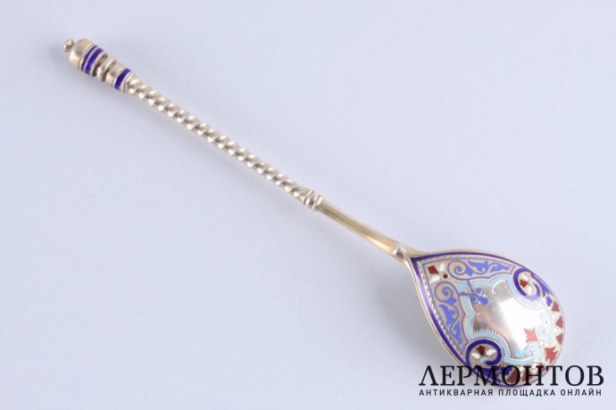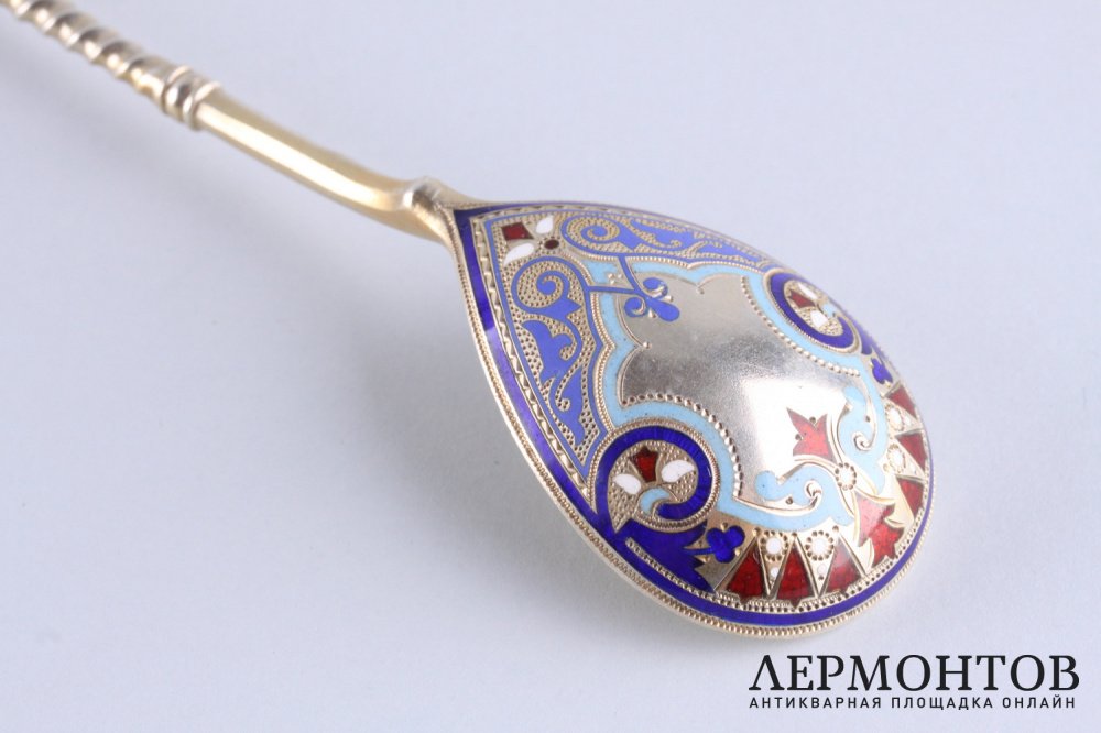 Антикварная ложка из серебра 84 пробы, изготовленная в Российской империи в Москве в мастерской поставщика императорского двора Ивана Хлебникова в 1887 году. Изделие украшено полихромной выемчатой эмалью и покрыто золочением.