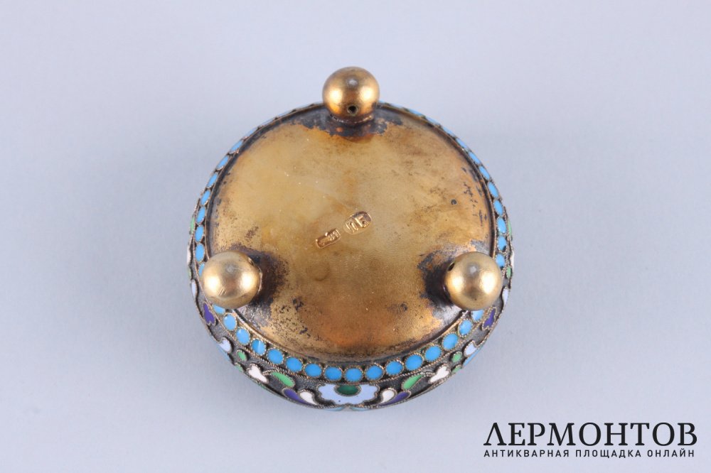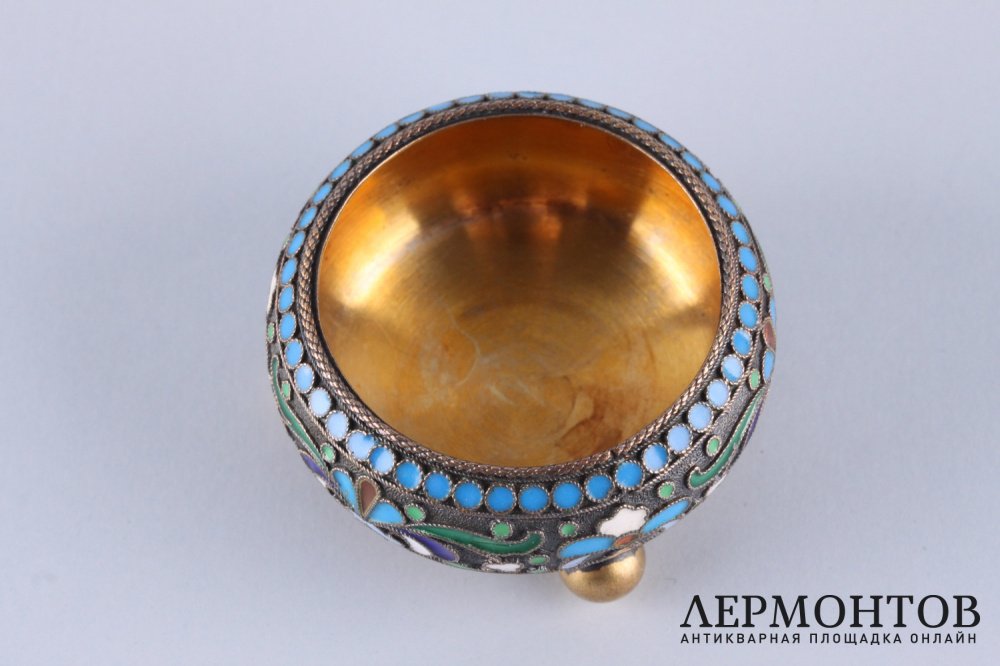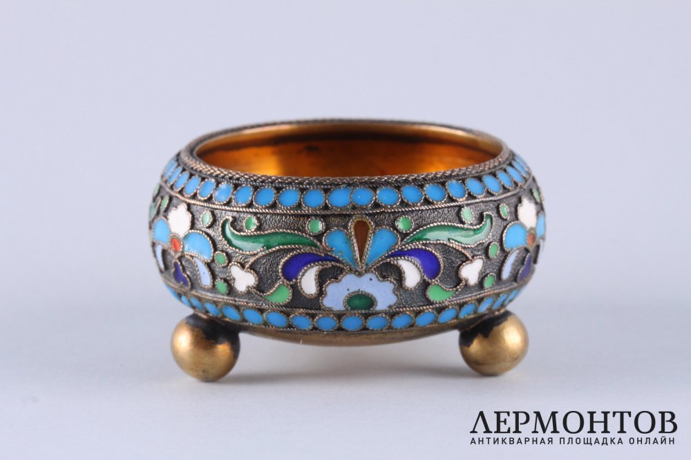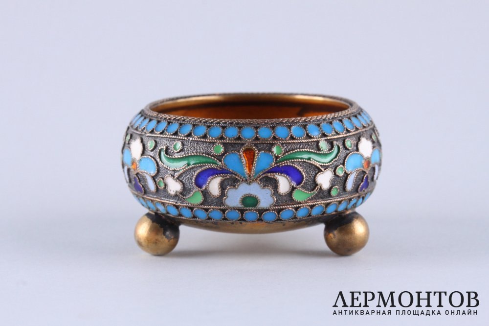 Антикварная солонка из серебра 84 пробы, изготовленная в Российской империи в Москве в мастерской Петра Баскакова в 1908 - 1917 годах . Украшена полихромной эмалью по скани. Отличная сохранность.
