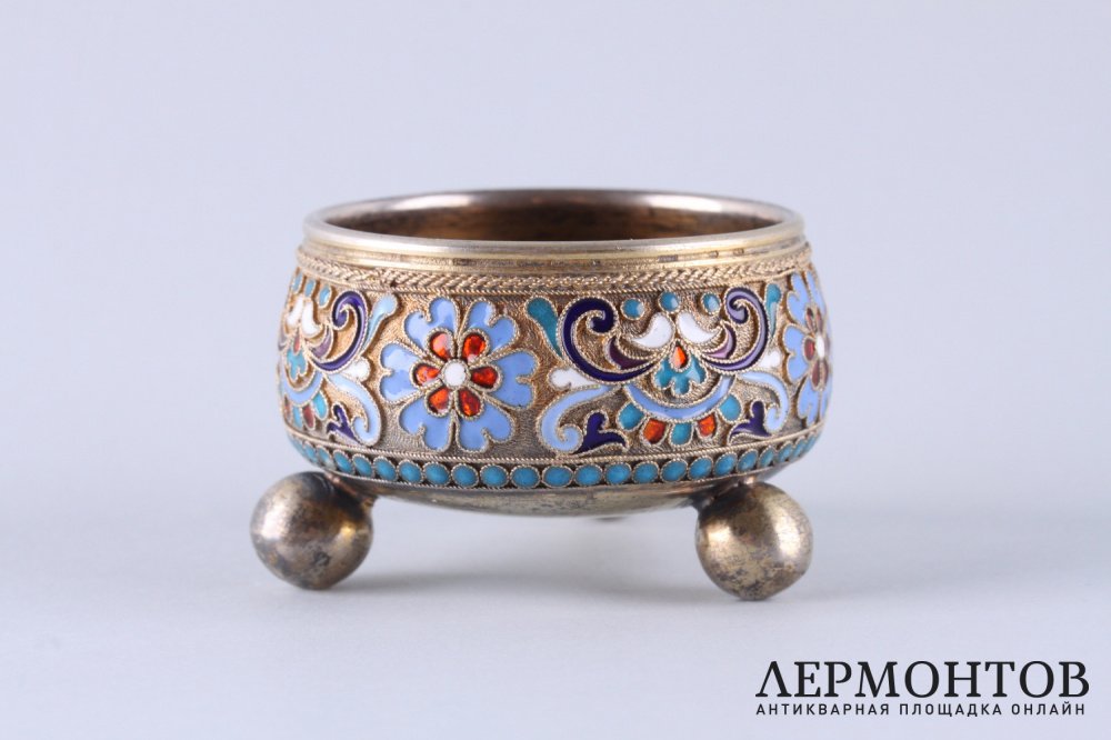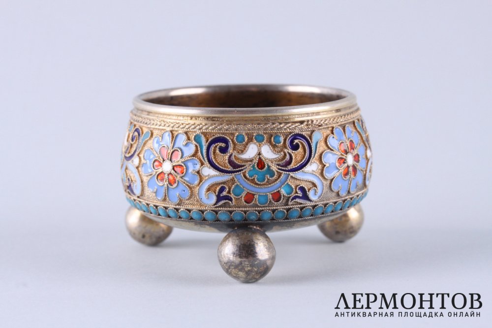 Антикварная солонка из серебра 84 пробы, изготовленная в Российской империи в Москве в 1891 году в мастерской Густава Густавовича Клингерта . Украшена полихромной эмалью по скани. Отличная сохранность.
