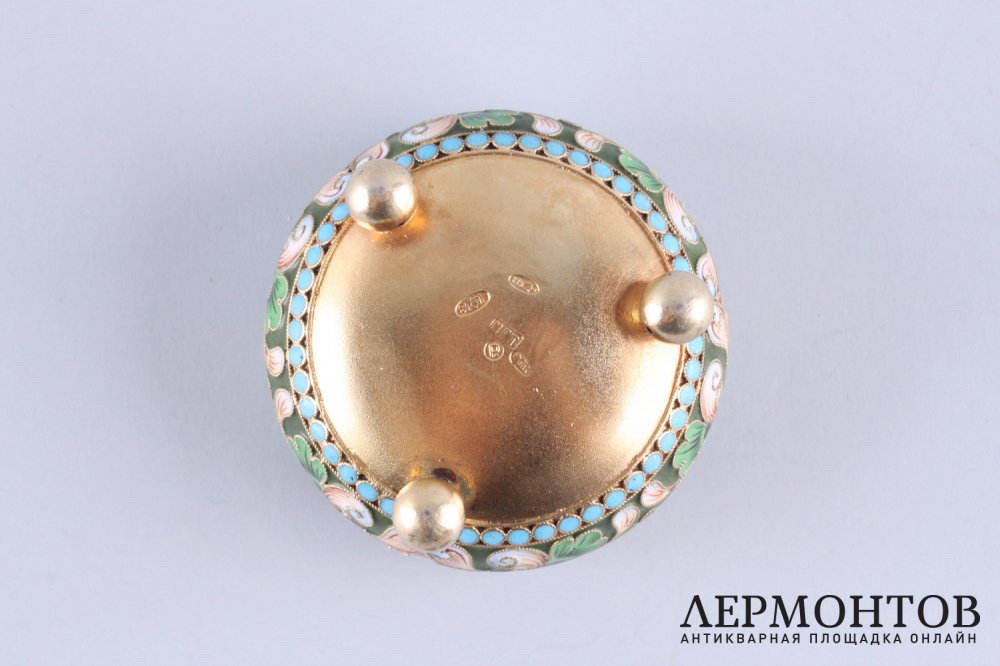 Антикварная солонка из серебра 84 пробы, изготовленная в Российской империи в Москве в мастерской Ильи Григорьевича Трыкина в 1899-1908 годах . Украшена расписной эмалью по скани. Отличная сохранность.