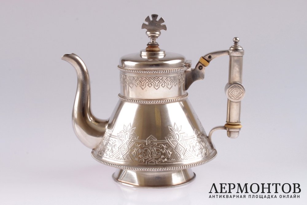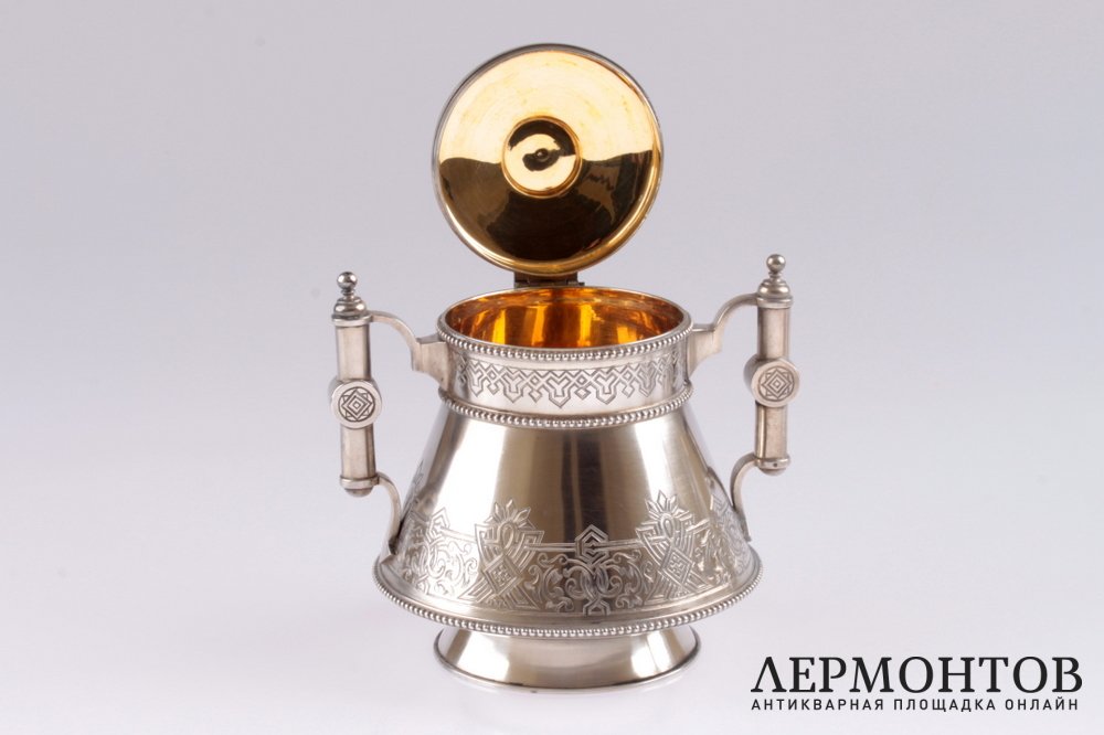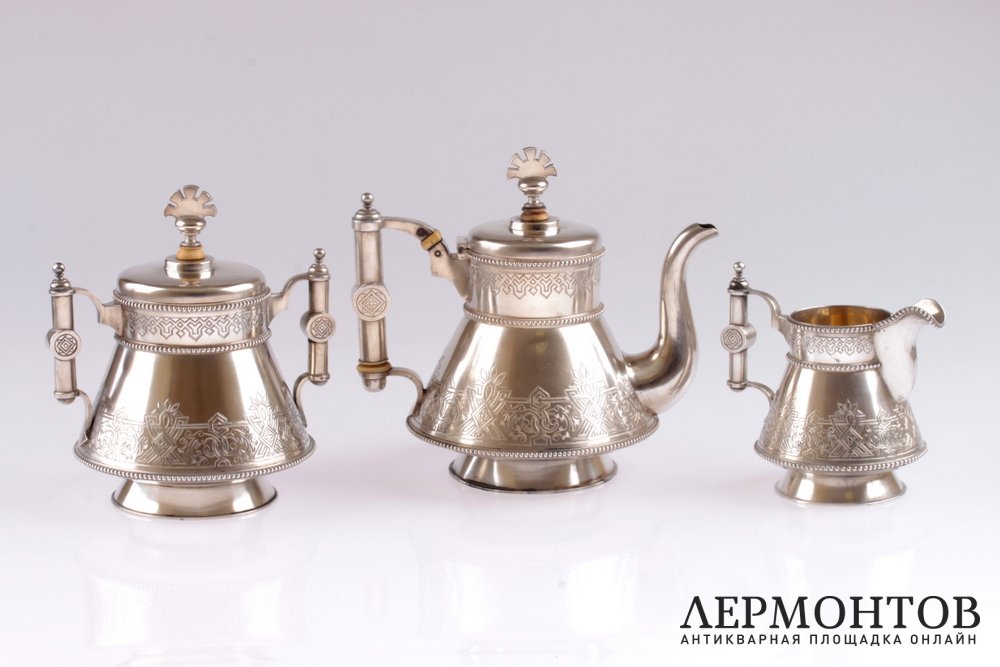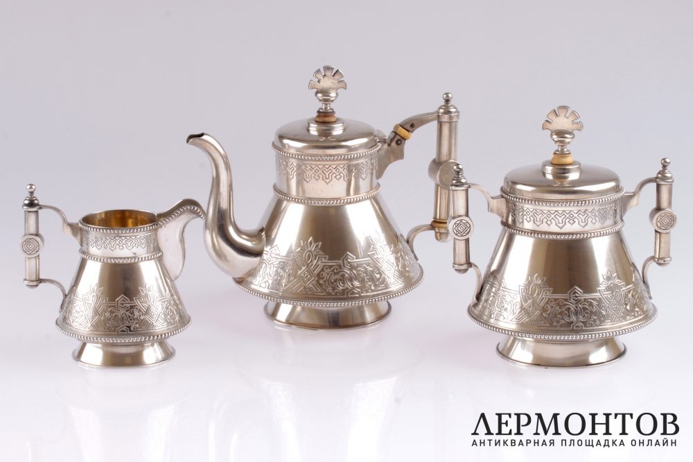 Редкий чайный сервиз, изготовленный в Петербурге в 1886 году из серебра 84 пробы. Выполнен в неорусском стиле. Состоит из трех предметов: чайника, сахарницы и молочника. Внутри предметы покрыты позолотой. Сохранен в хорошем состоянии.
