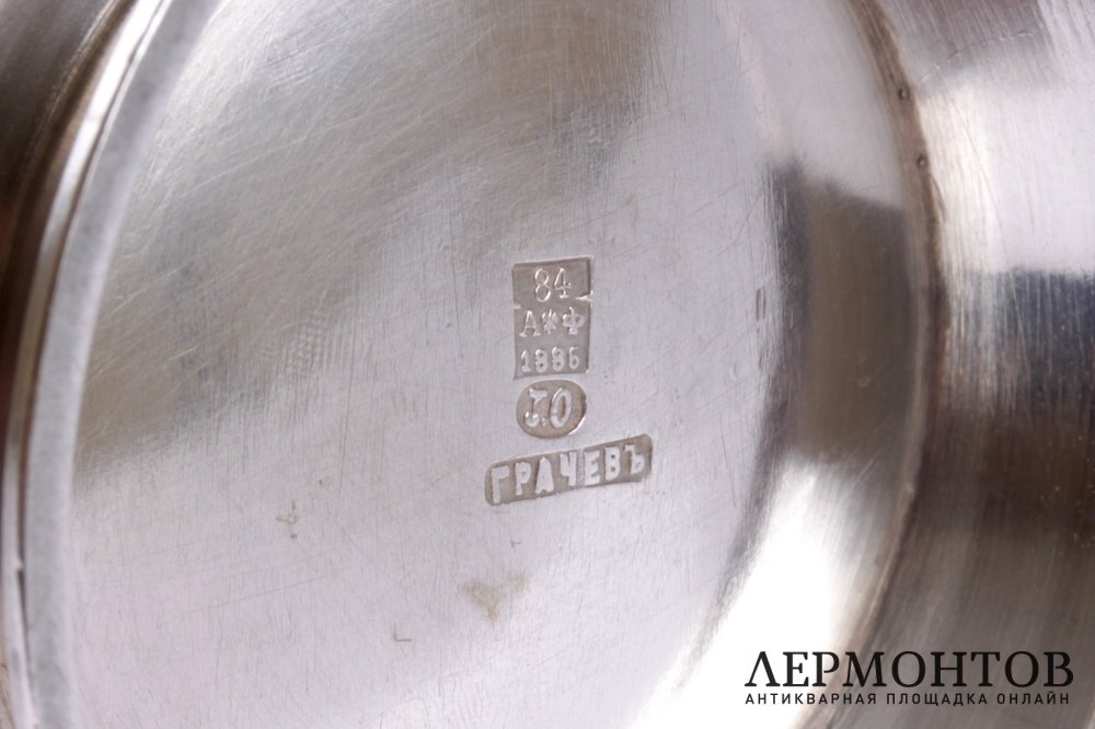 Сервиз изготовлен в мастерской Ольсониуса Иогана Фердинанда. Иоган Фердинанд родился в Финляндии в 1823 году. Учился в Петербурге, где в 1842 году стал подмастерьем и в 1852 году - мастером ювелиром. Работал для фирмы Грачева. Умер в 1888 году. (Постникова-Лосева #1611).