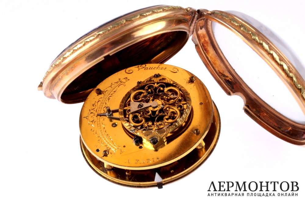 Старинные карманные часы, изготовленные в мастерской Vauchez в Париже в конце XVIII века. Корпус выполнен из трех цветов золота 750 пробы: желтого, розового и зеленого. С обратной стороны корпус украшен эмалью с рисунком и надписью: "A cet oiseau tu rend la liberte" (Этой птице ты даешь свободу). Циферблат белого цвета с римскими и арабскими цифрами. Отличное состояние корпуса. Механизм в рабочем состоянии, но необходима корректировка. В комплекте с часами идет латунный кейс.