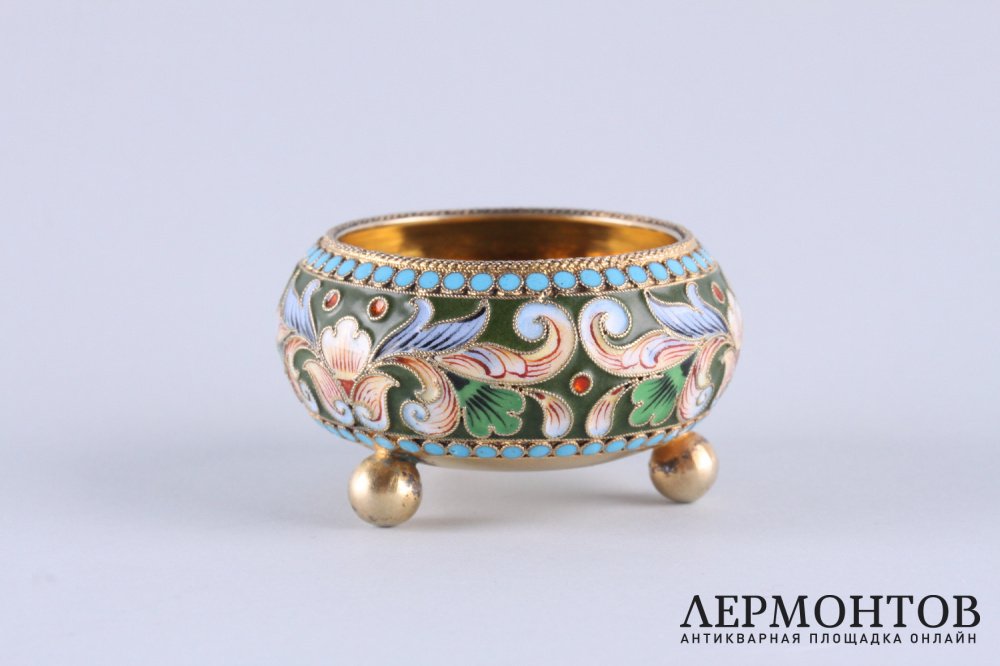 Антикварная солонка из серебра 84 пробы, изготовленная в Российской империи в Москве в мастерской Ильи Григорьевича Трыкина в 1899-1908 годах . Украшена расписной эмалью по скани. Отличная сохранность.