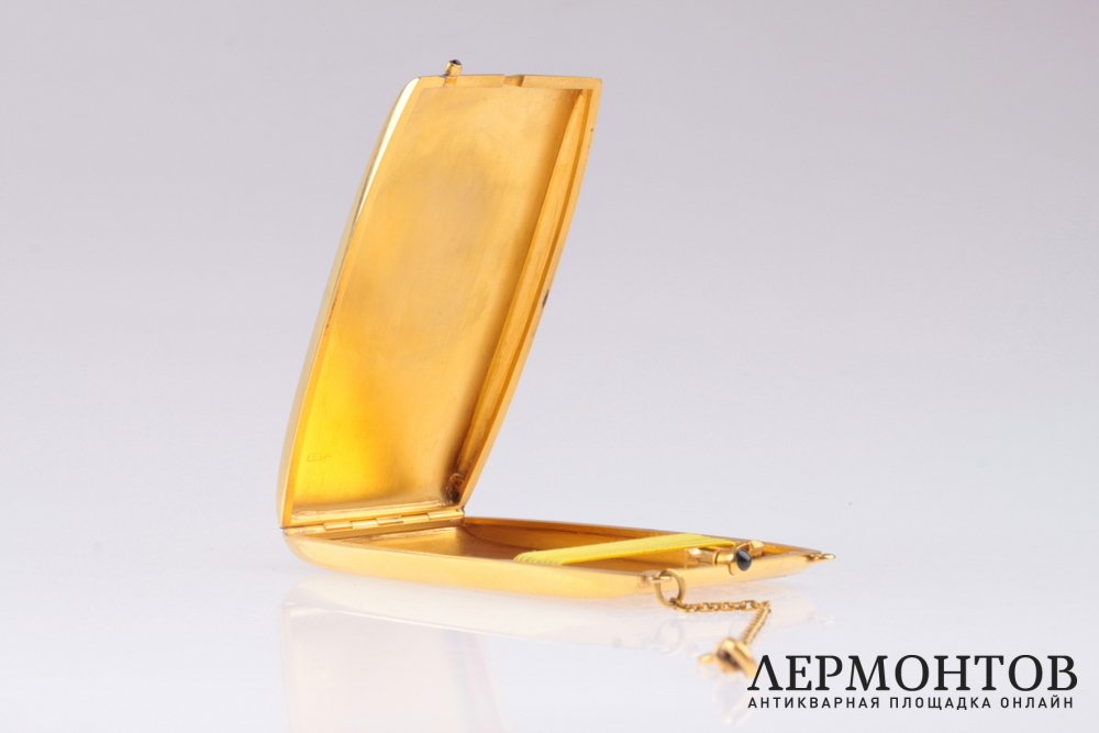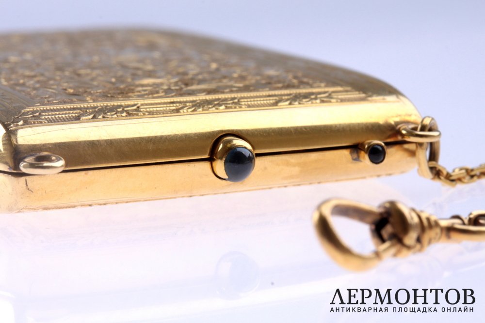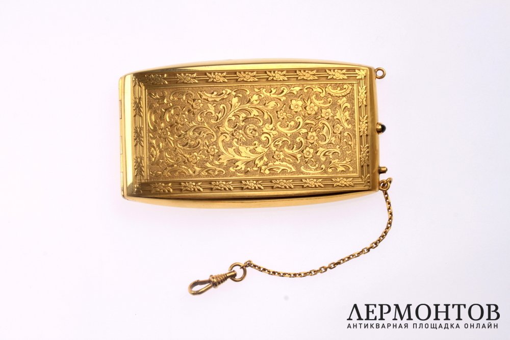 Антикварный портсигар, изготовленный из золота 585 пробы. Вся поверхность украшена ручной гравировкой с изображением растительно-цветочного орнамента. В наличии сертификат. Превосходное качество, отличное состояние!